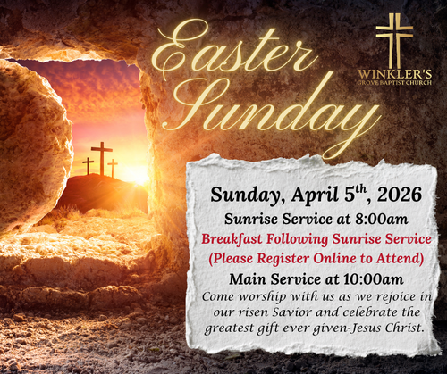 Welcome to Winkler's Grove Baptist Church! We are a praying church where faith, family, and fellowship come together. Join us in worship, grow with us in God's Word, and experience the love of Christ. We would love to meet you, lift you in prayer, and encourage you as we walk together in God's love.